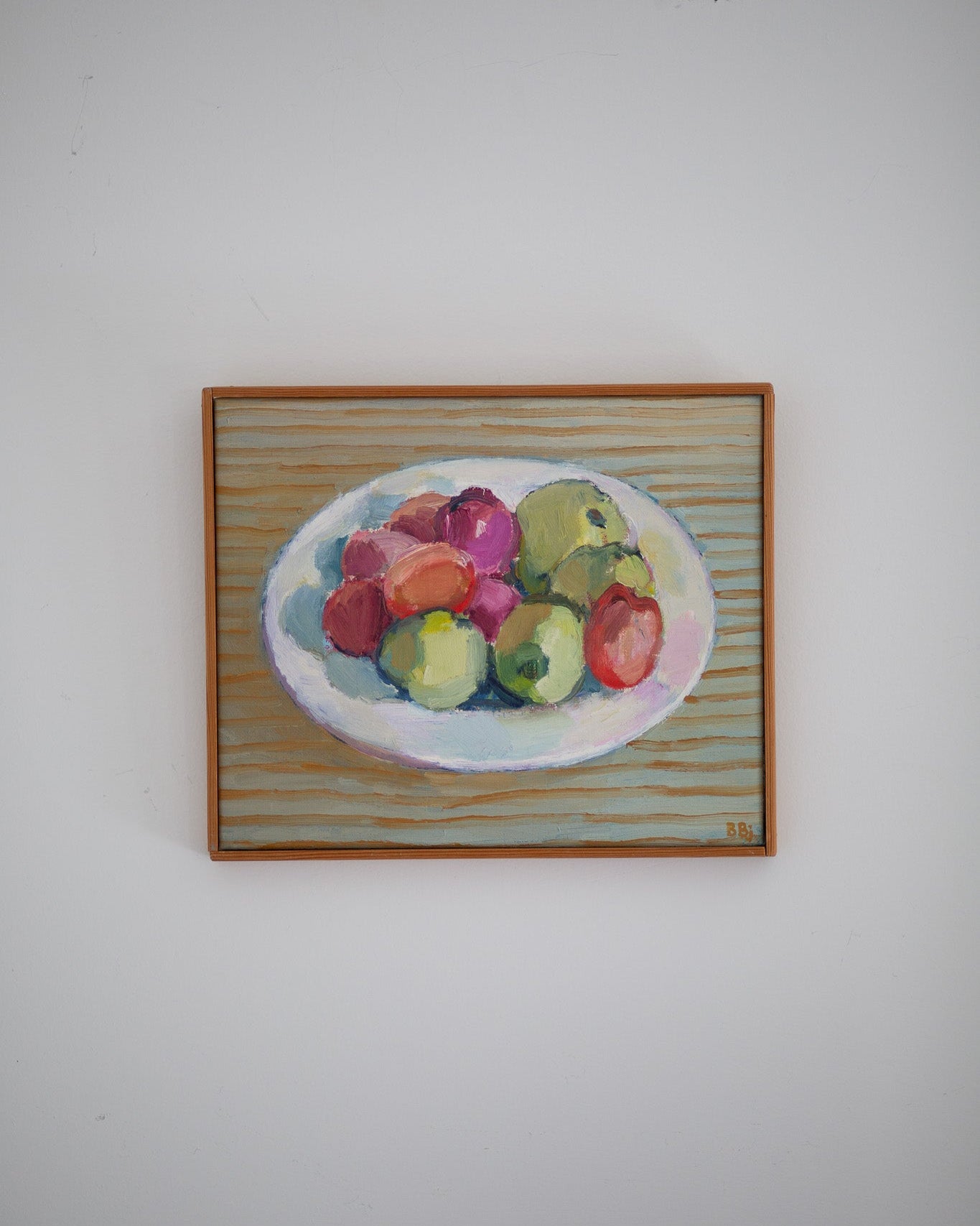 A charming 1988 still life featuring a vibrant fruit bowl set against a subtly striped background. The rich, textured brushstrokes and bold use of color bring warmth and energy to this classic composition, making it a perfect addition to any art collection or interior space.