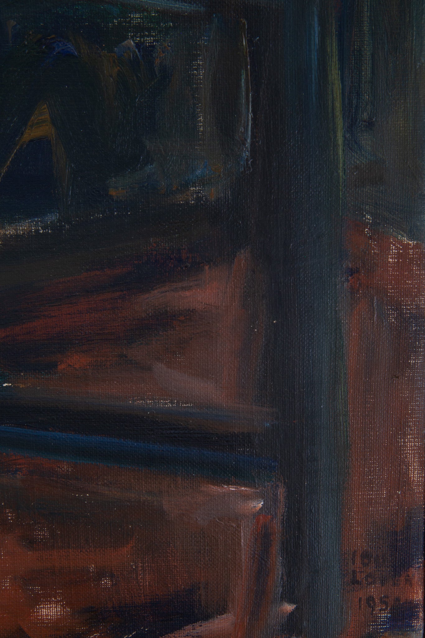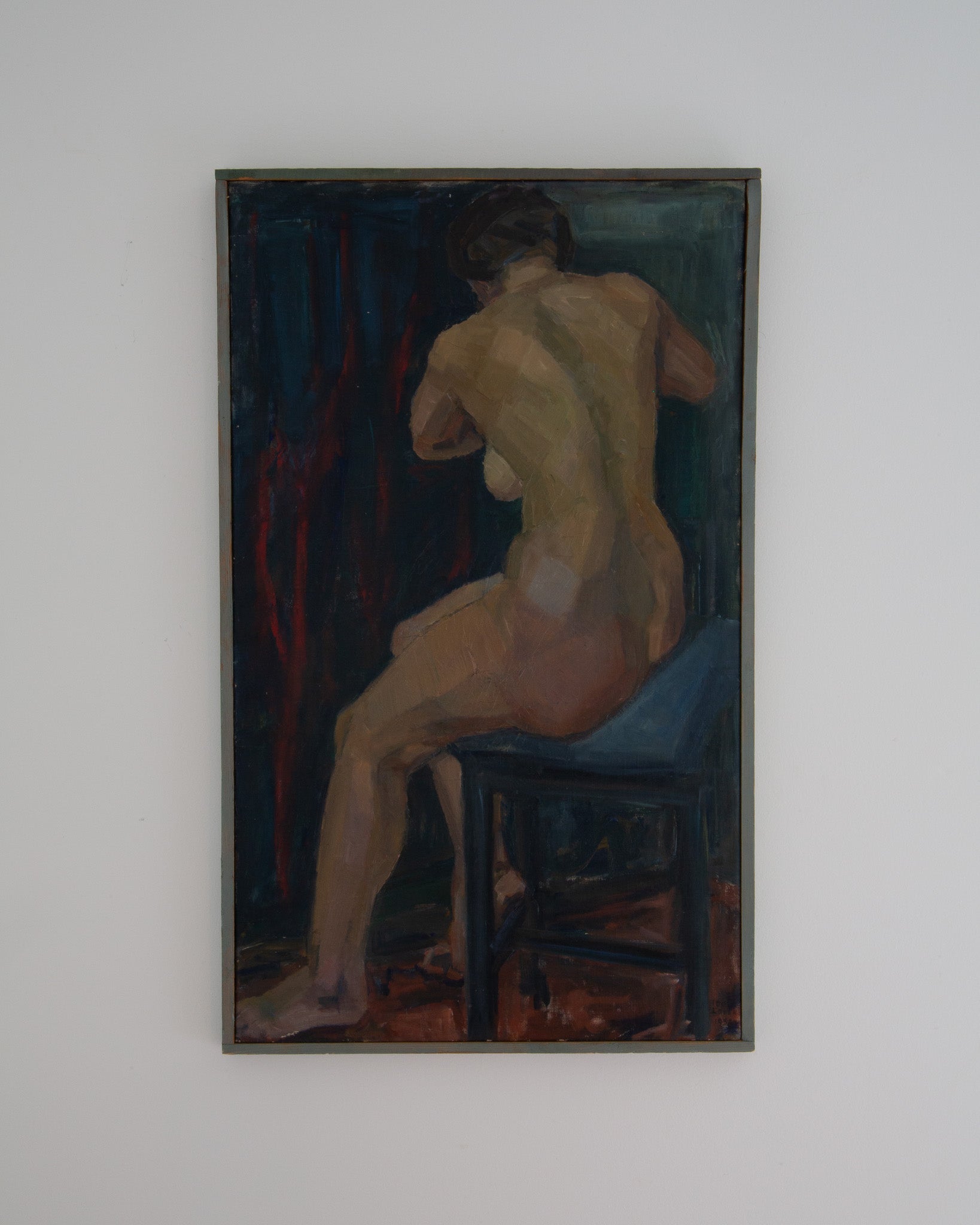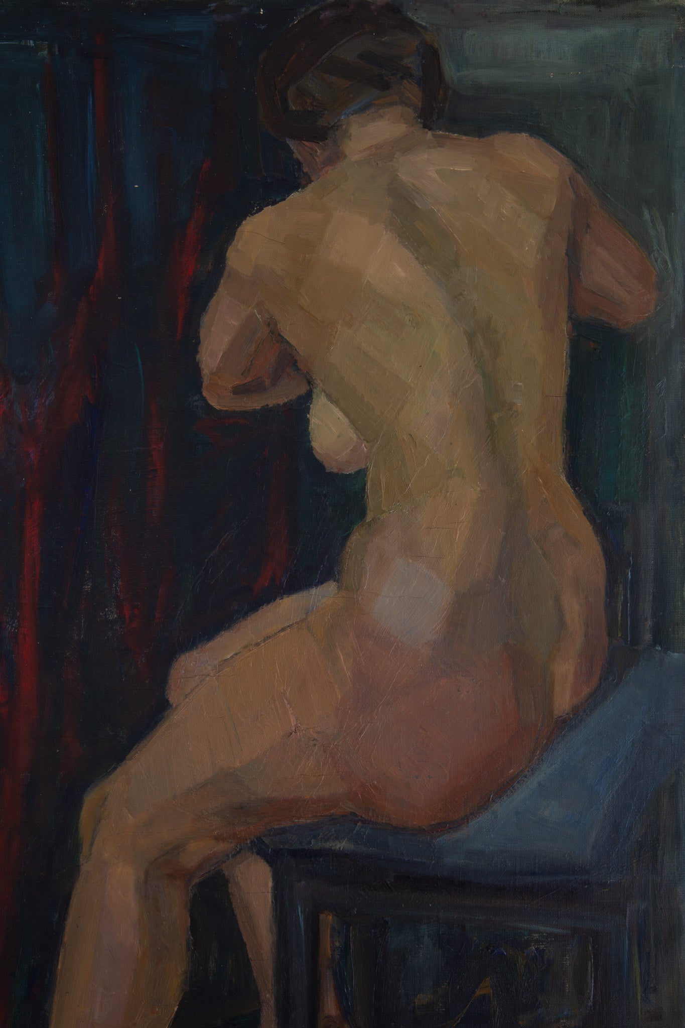 Ryggen (“The Back”) is a beautiful mid-century oil painting by Swedish artist Idun Lovén, showcasing her unique style and deep understanding of the human form. Created in the 1950s, this piece captures the emotional depth and vulnerability of its subject through bold brushstrokes and a rich, muted color palette. The warm earthy tones of the figure contrast with the deep blues of the background, creating a feeling of both intimacy and timelessness.