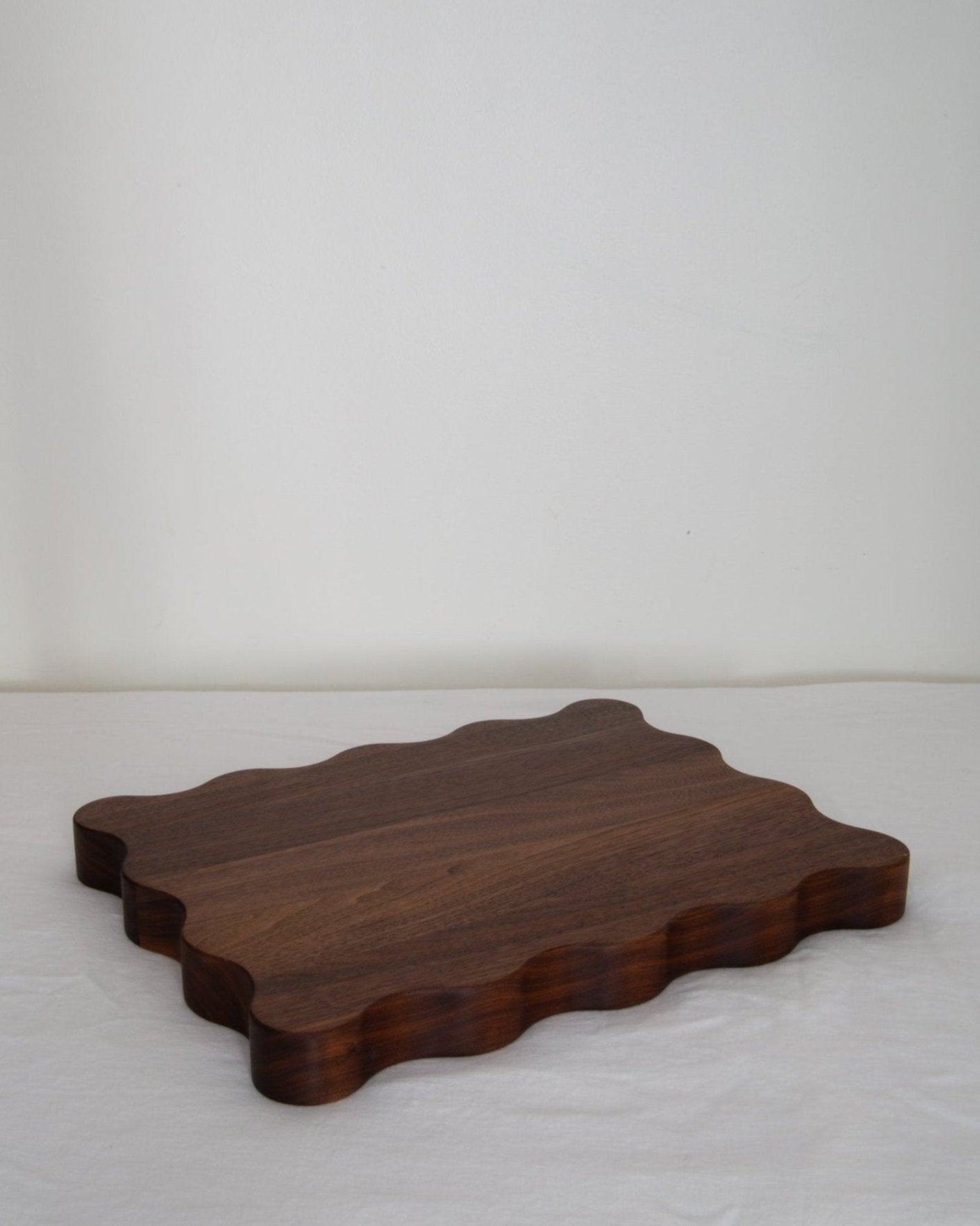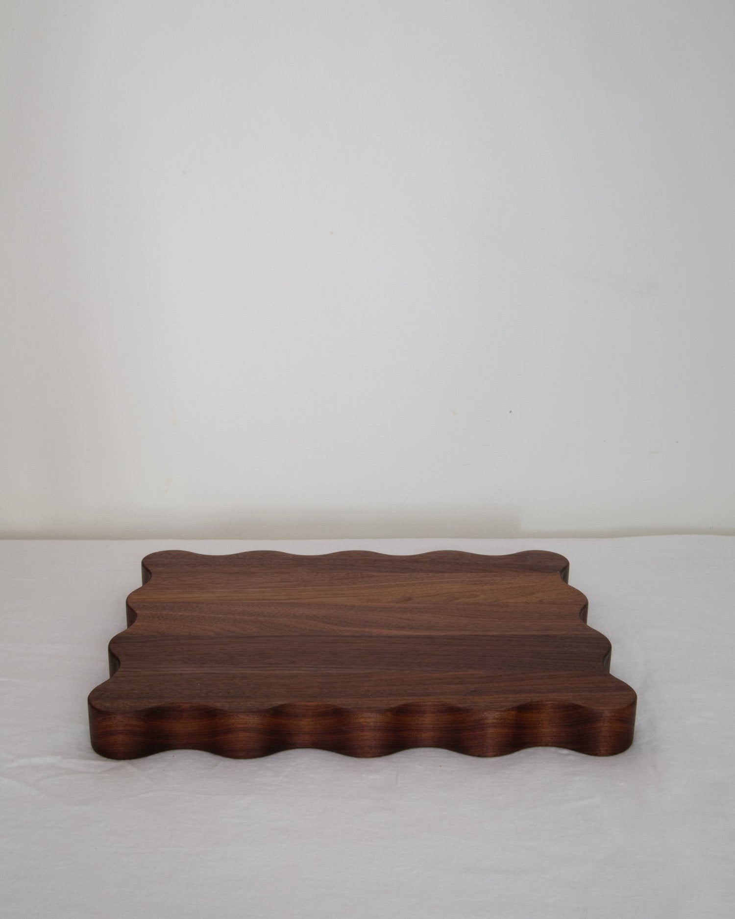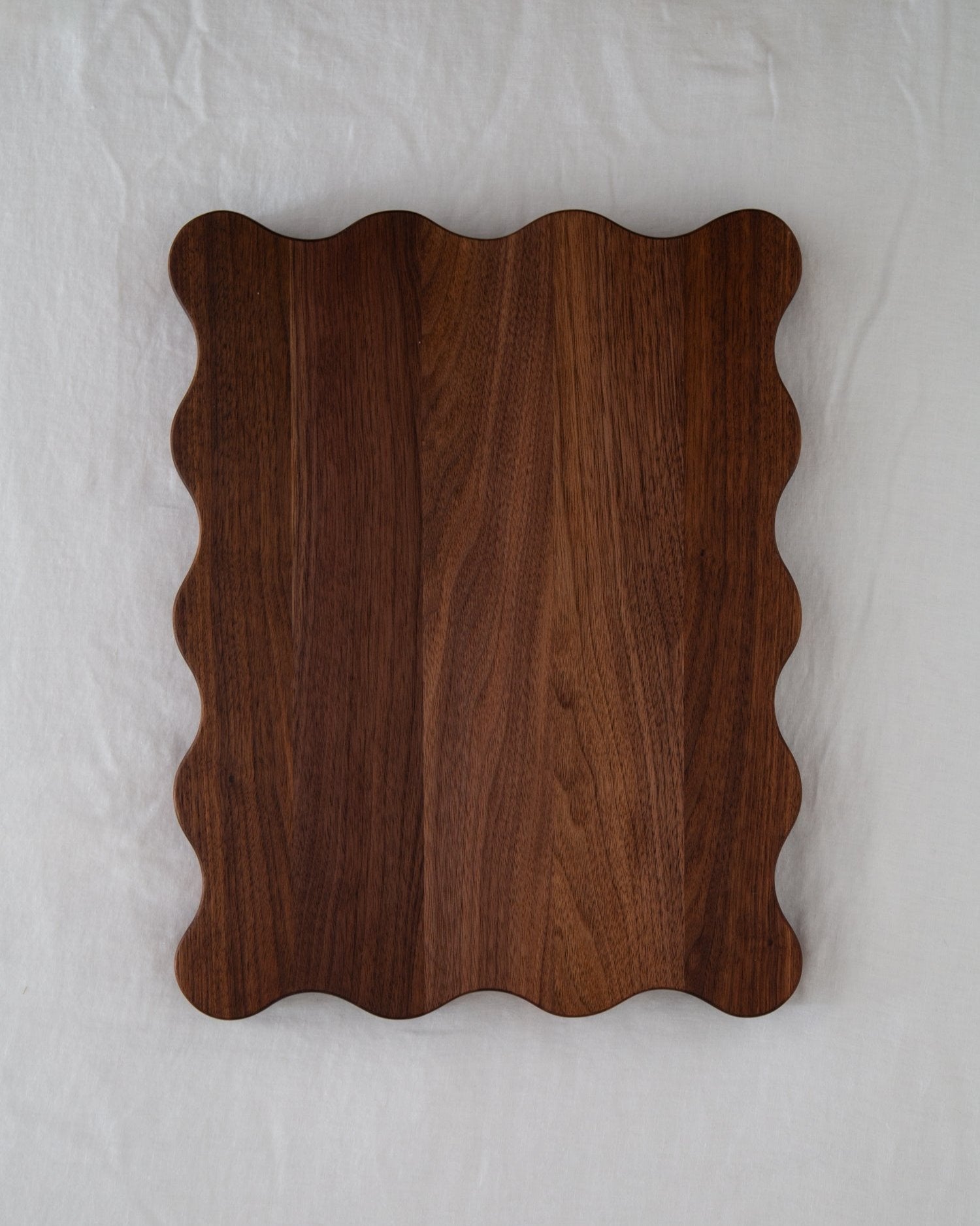 Made for the countertop from 1.75 inch thick walnut, the wavy board brings both beauty and function to the kitchen. The wavy edges offer a unique detail that separate this board from a basic butcher block giving visual interest and elegance. Each board is thoughtfully handcrafted and made with care to endure years of use in the kitchen.
