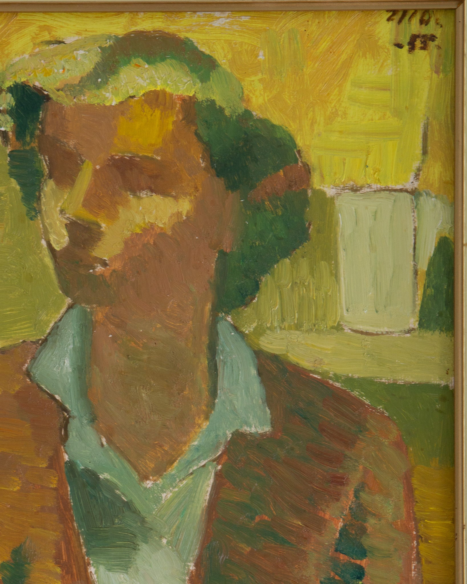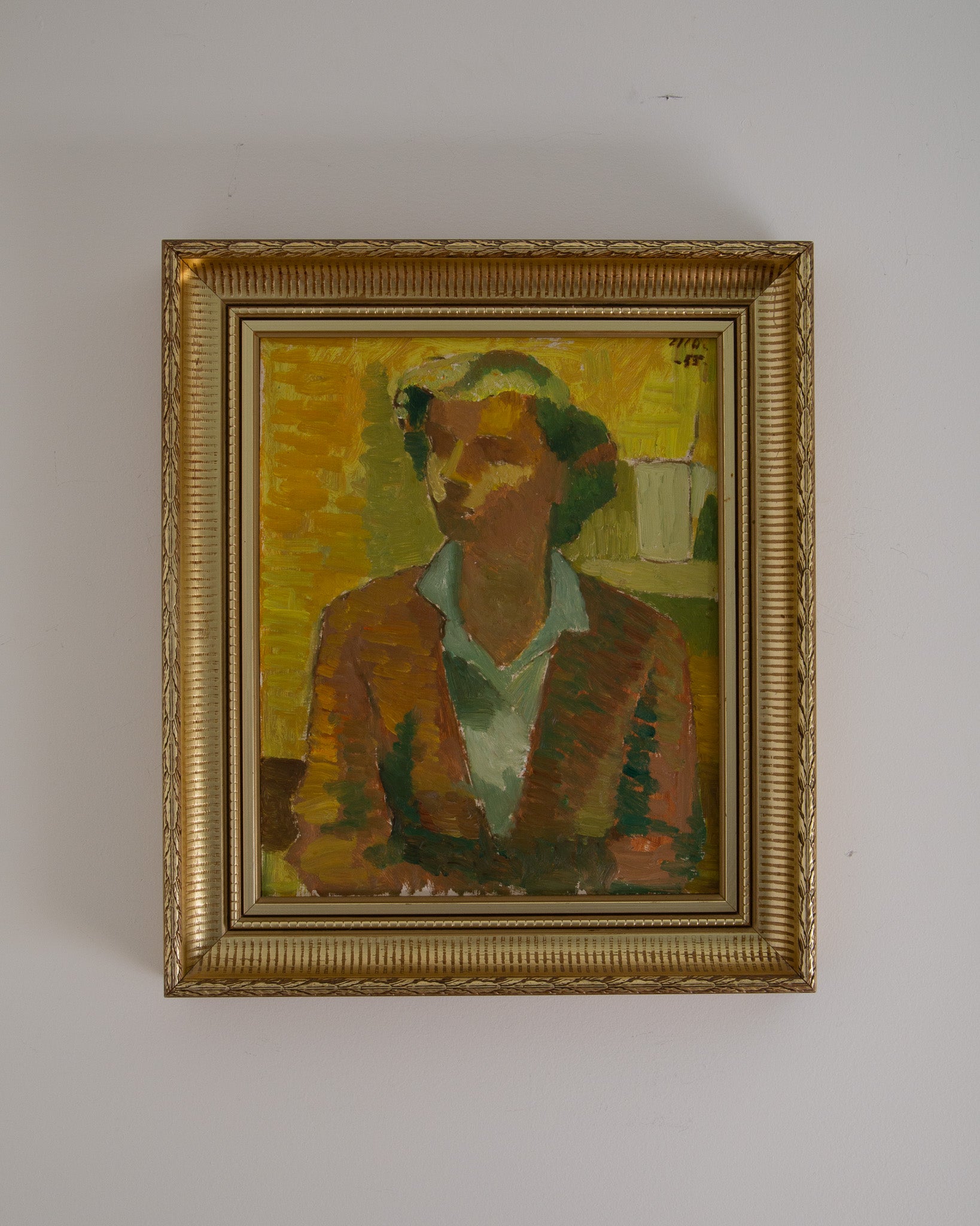 A striking mid-century portrait painted in warm, expressive strokes. Golden yellows and earthen greens build a softened figure, abstracted just enough to leave space for mystery. Framed in ornate gilt, it brings a timeless, European sensibility—bold yet quiet, collected yet deeply personal.