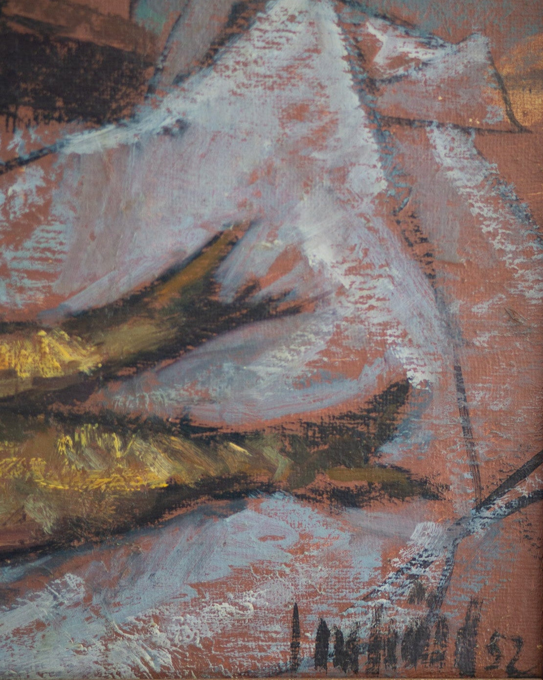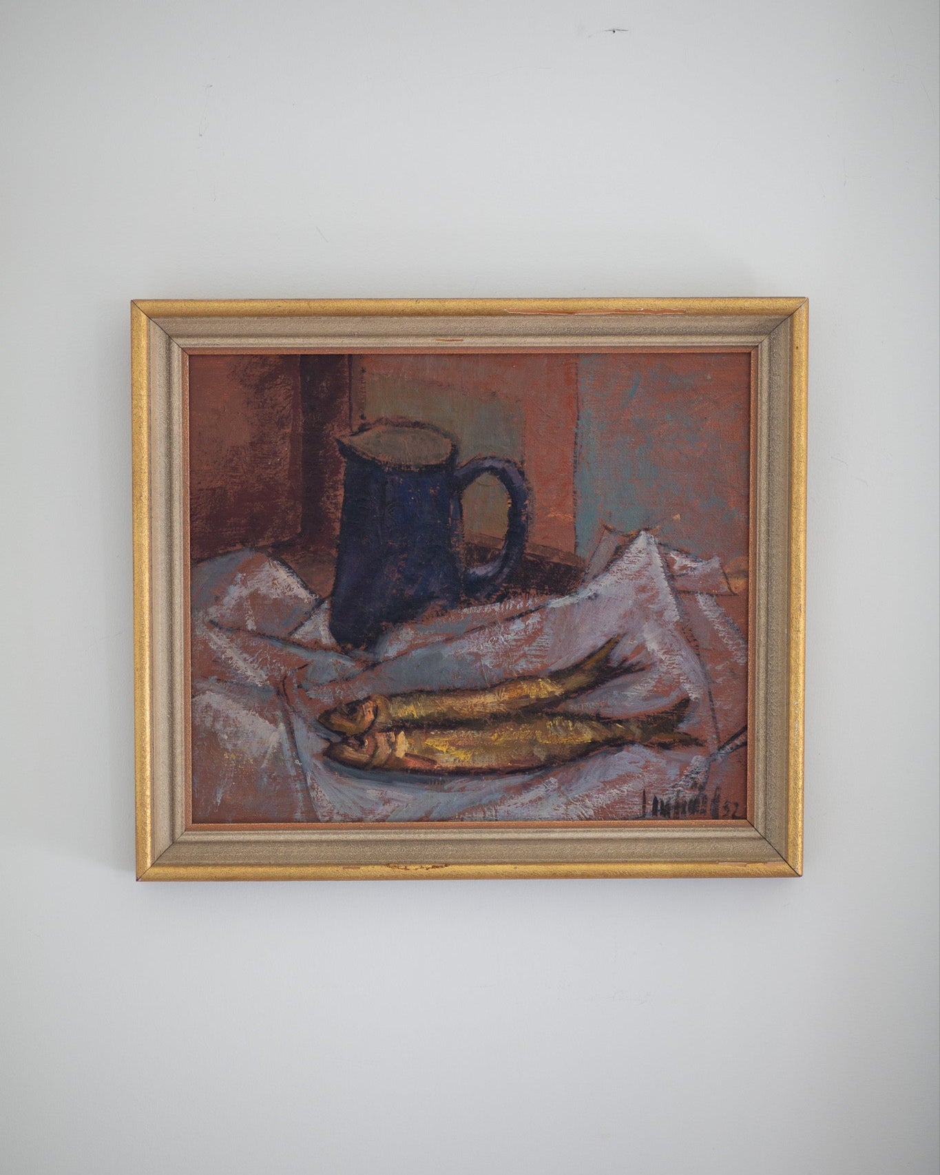 Freshly caught fish lie on the fishmonger’s wrap. Richly painted oil on board with impasto tones of rust, rose, and navy. Striking addition to a kitchen or any interior.