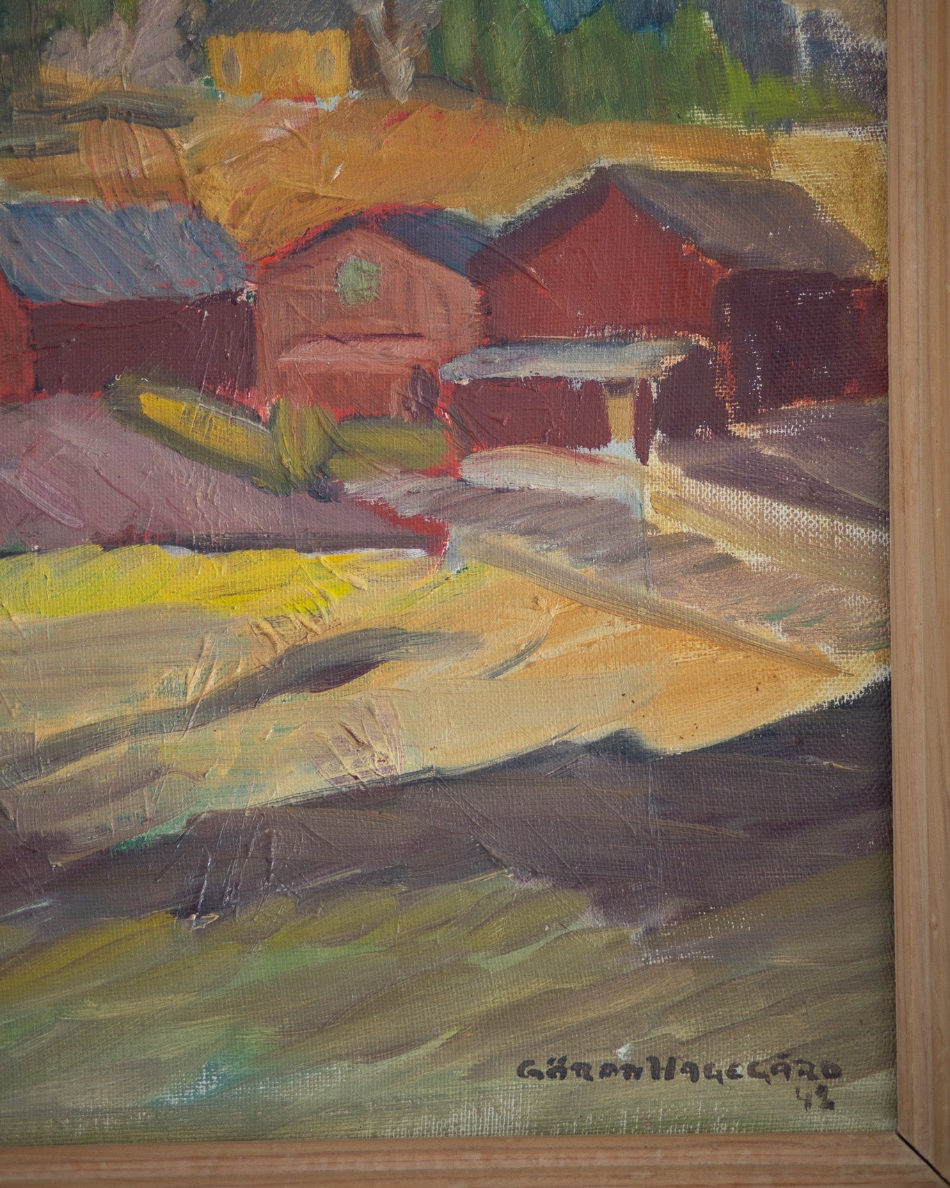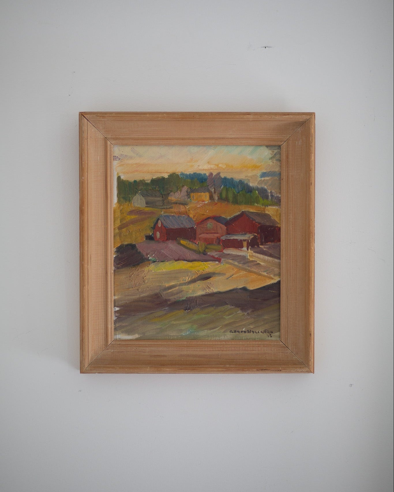 Charming landscape oil painting of a rural farmstead, under a late afternoon or early evening sky.