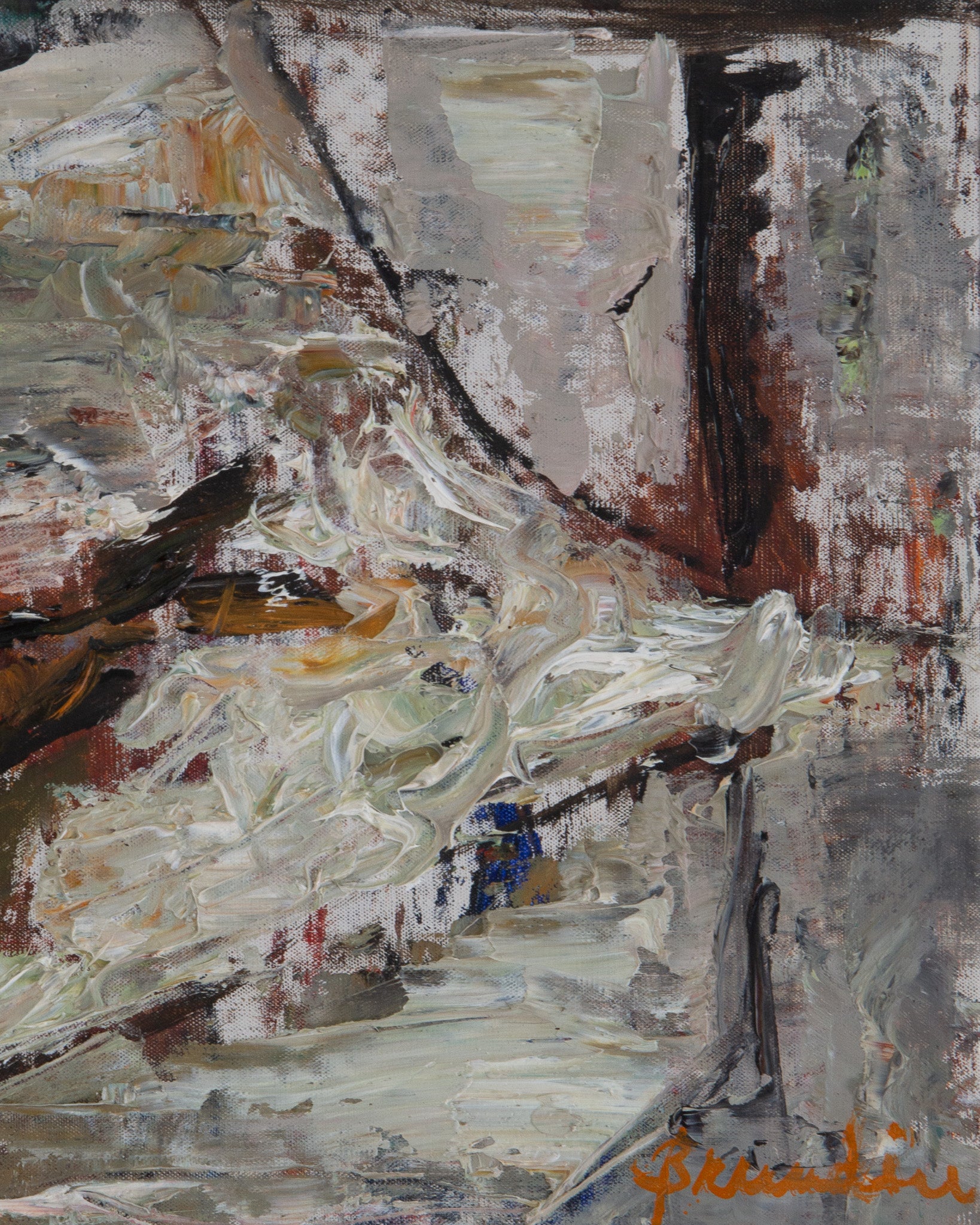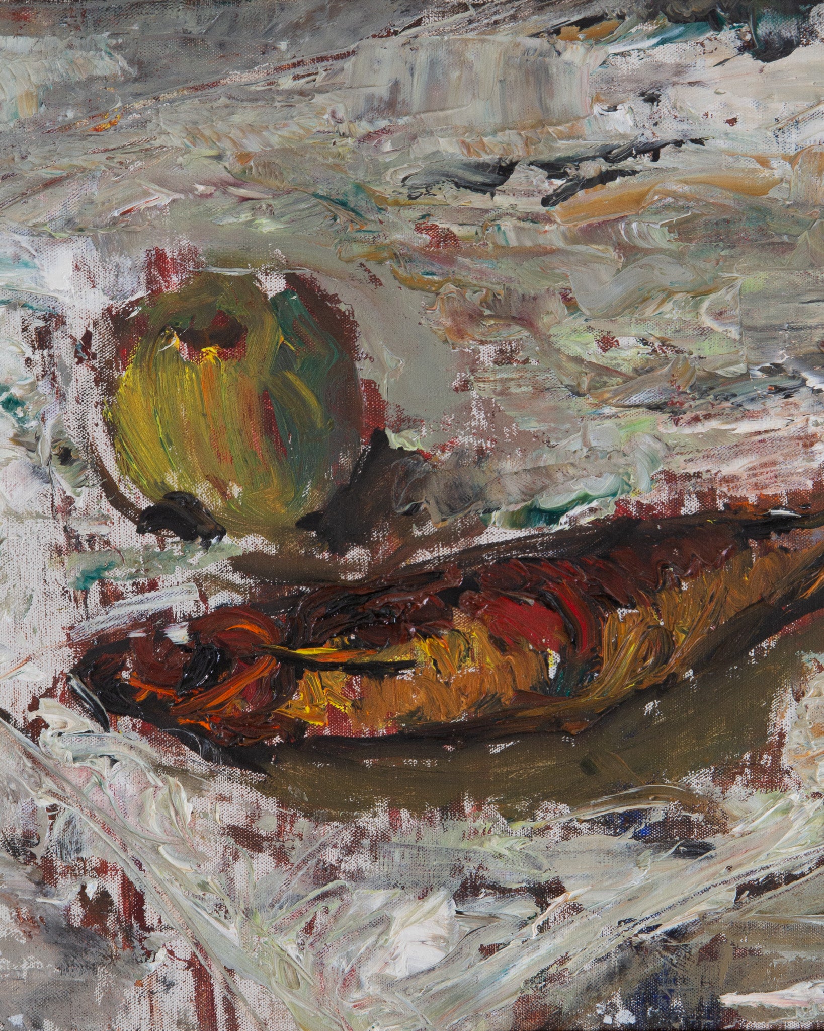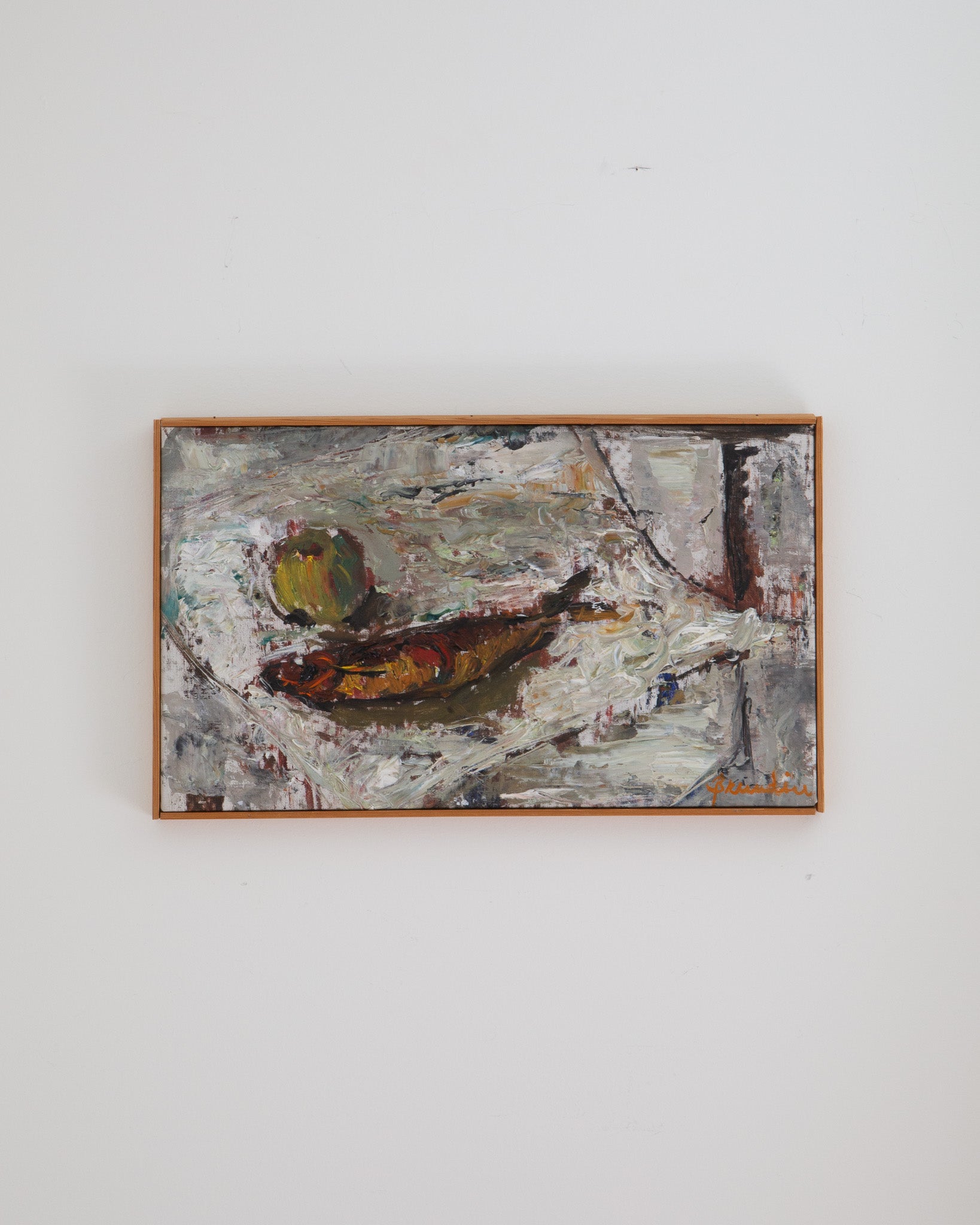 This piece presents a unique take on the traditional genre, showcasing a fish and an apple rendered in an expressive, abstract style. Bold brushstrokes and a muted color palette create a dynamic yet harmonious composition. The textures and forms come together in a way that sparks the imagination, inviting the viewer to find their own meaning within the artwork.