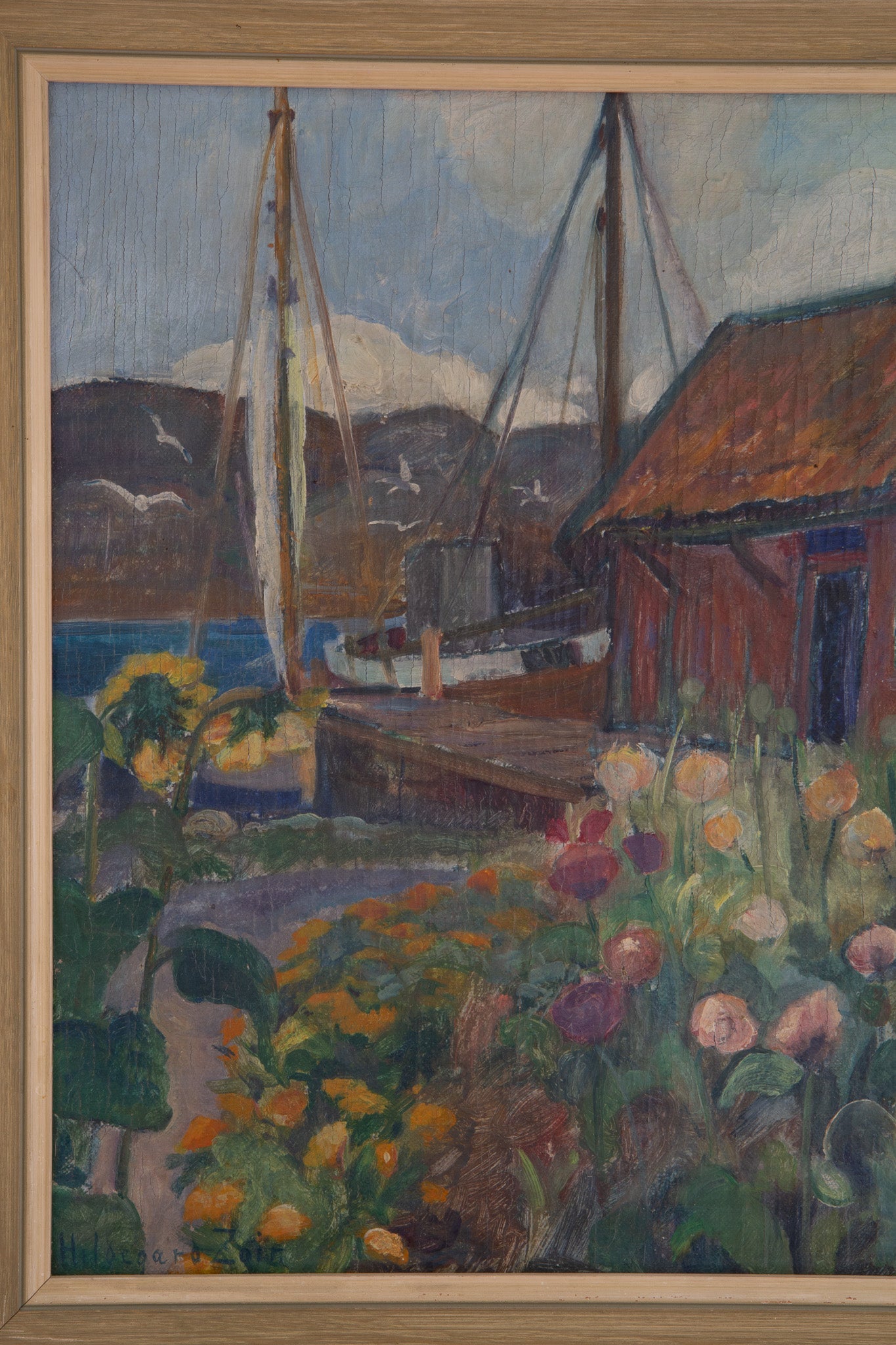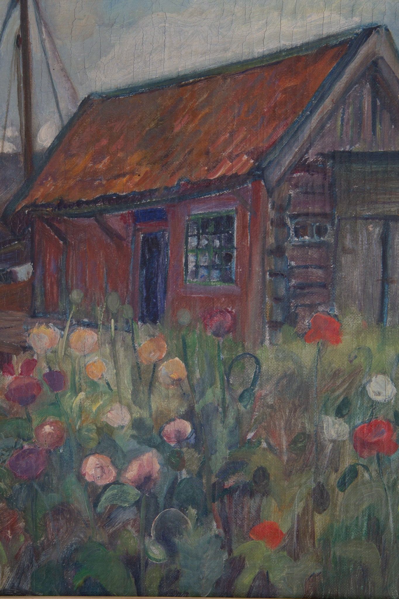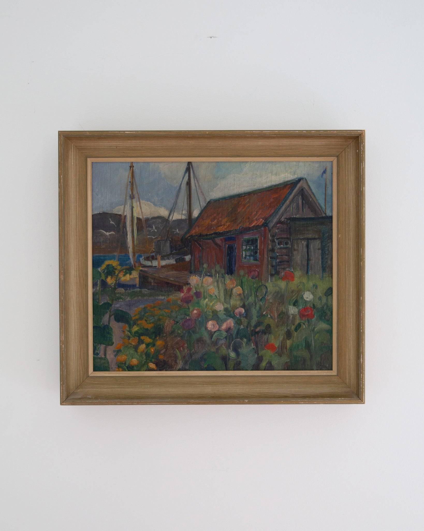 This painting is full of charm. With its faded colors and tiny cracks, it feels like a little piece of history. The artist, Hildegard Zoir, captured a moment in time, a peaceful scene of a cottage by the sea. You can almost hear the gentle lapping of waves and smell the salty air.