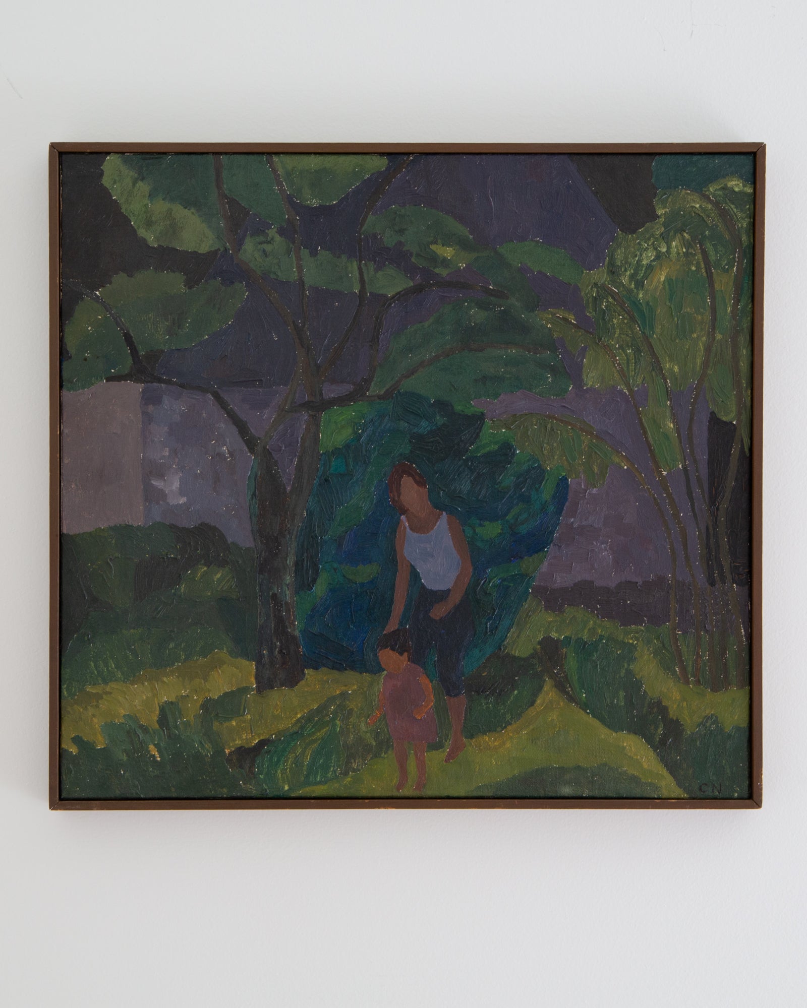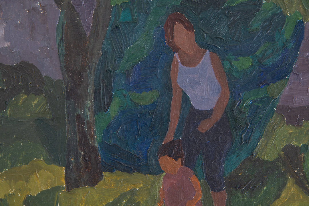 This original oil painting captures a tranquil moment between a woman and child surrounded by lush greenery, with soft earthy tones and expressive brushstrokes that create an inviting, peaceful atmosphere.
