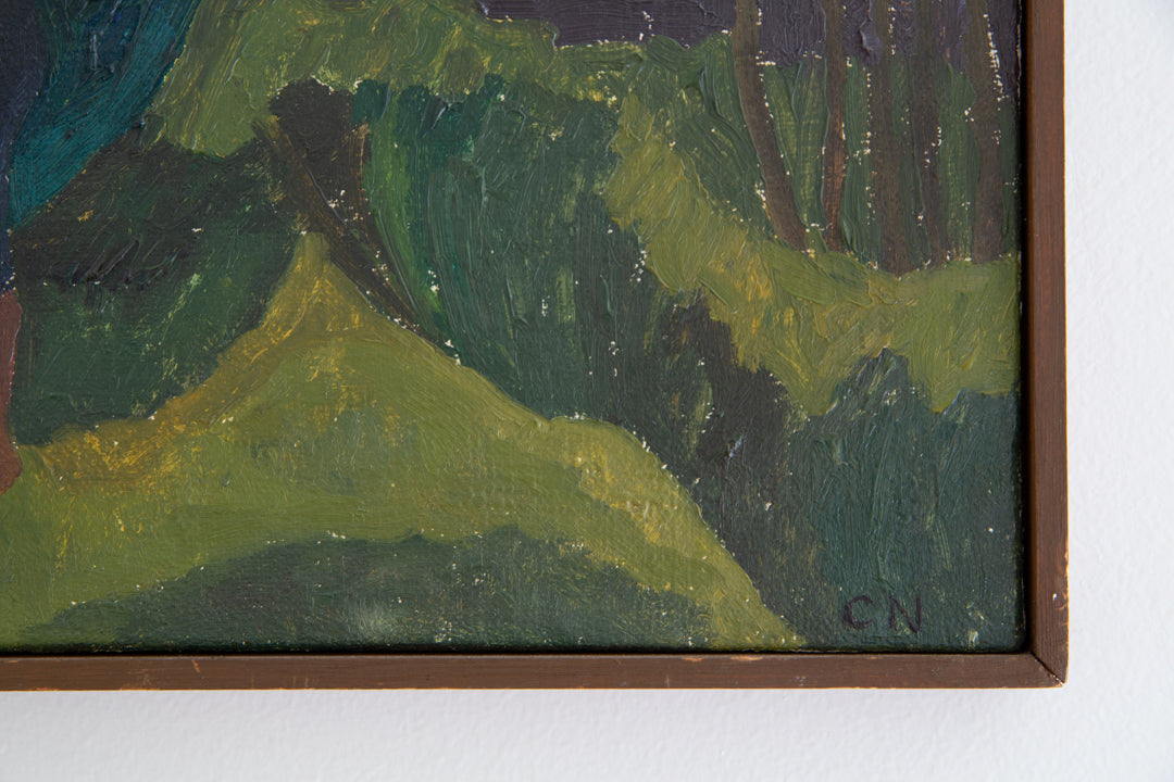 The painting reflects a timeless style, using deep greens and hints of blue and purple to evoke a natural setting that feels almost dreamlike. Its simplicity and subtle detailing make it a versatile piece, perfect for adding a touch of warmth to any room.